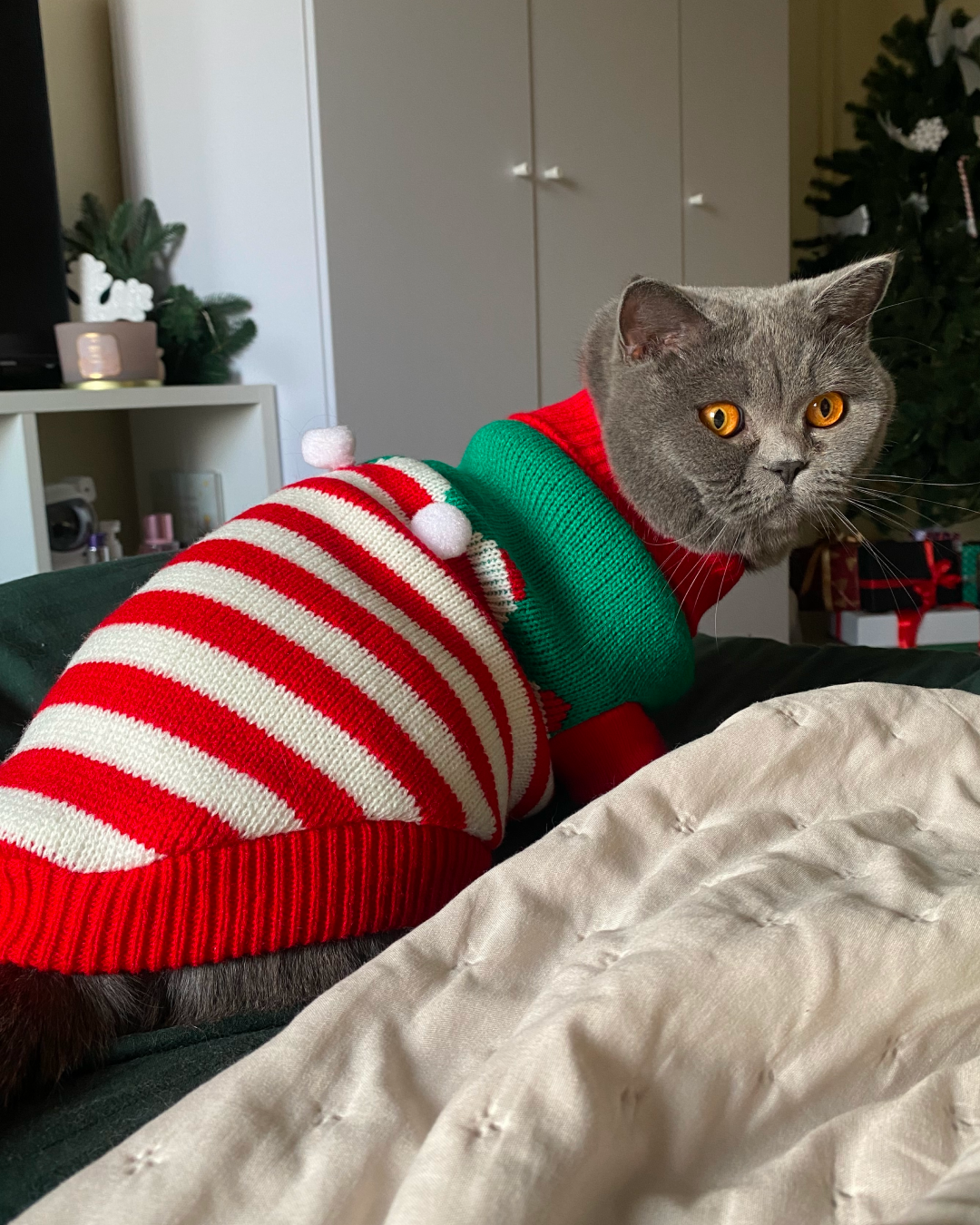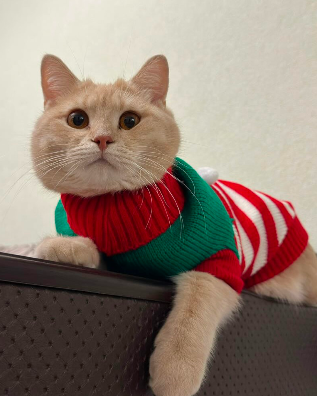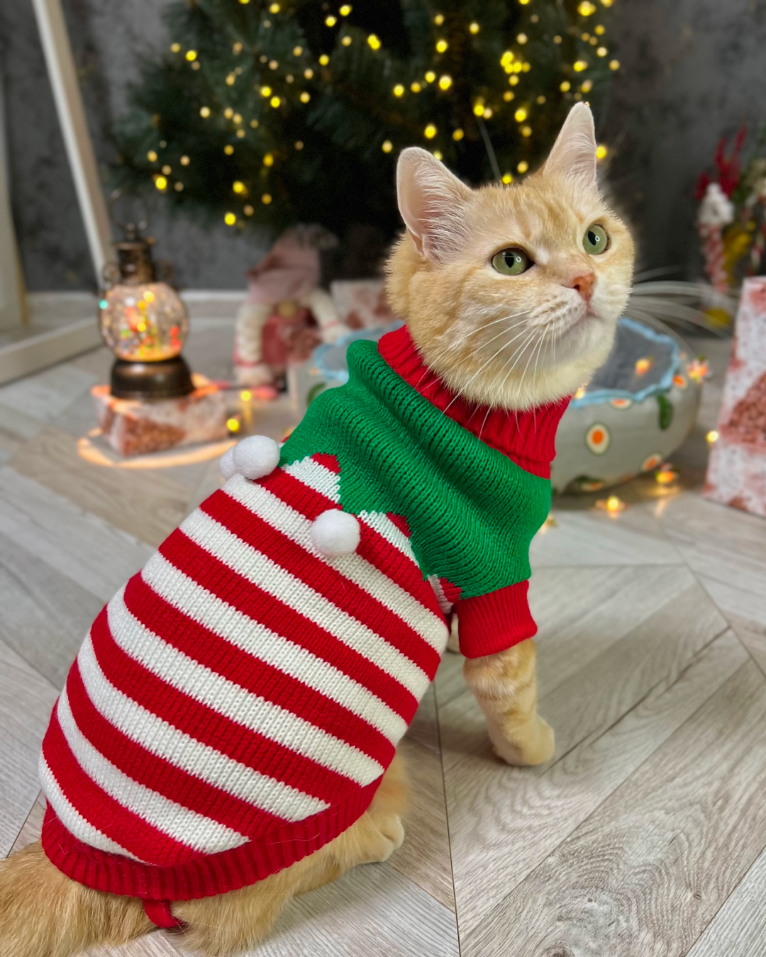 Цей святковий светрик створений, щоб ваш котик став головною зіркою новорічних свят! М’який трикотаж дарує комфорт і тепло, не обмежуючи рухів. Біло-червоні смужки й пухнасті помпони додають святковості, а яскравий дизайн створює справжню атмосферу Різдва.