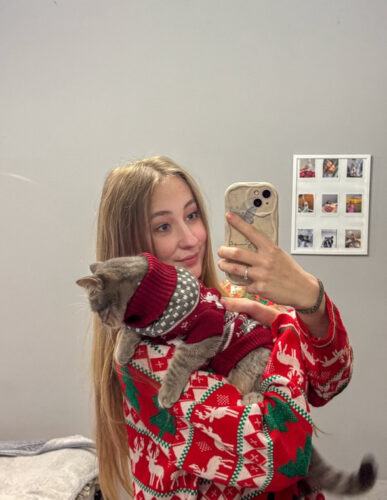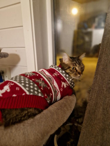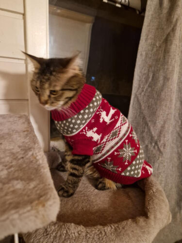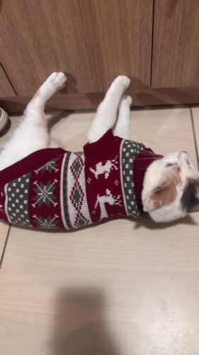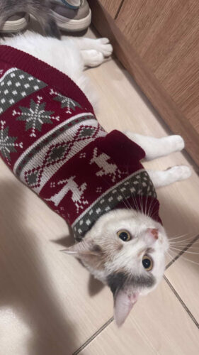 Цей святковий светрик створений, щоб ваш котик став головною зіркою новорічних свят! М’який трикотаж дарує комфорт і тепло, не обмежуючи рухів. Біло-червоні смужки й пухнасті помпони додають святковості, а яскравий дизайн створює справжню атмосферу Різдва.