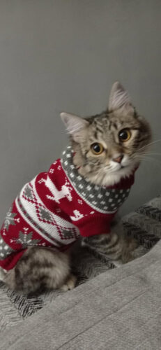 Светрик створений, щоб ваш котик виглядав просто неймовірно під час зимових свят! М’який, теплий і зручний, він не колеться, не заважає рухатись і дарує справжній комфорт. Бордовий колір і візерунок з оленями додають святкового настрою, а сам светрик чудово підходить для домашніх прогулянок чи різдвяних фото.