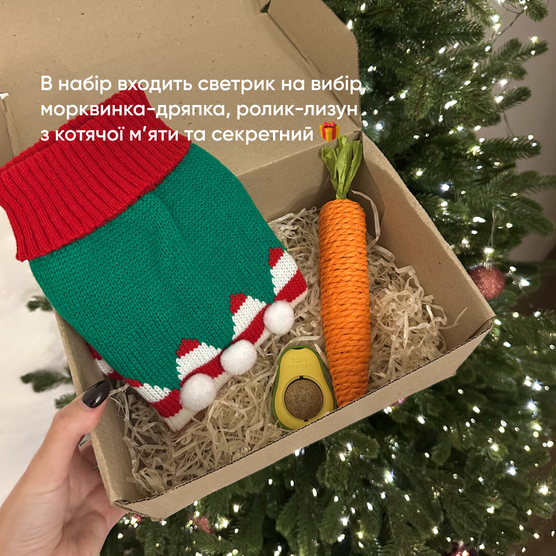 | У наборі | Святковий светрик на вибір, морквинка-дряпка, м'ятний лизунець і секретний подарунок |