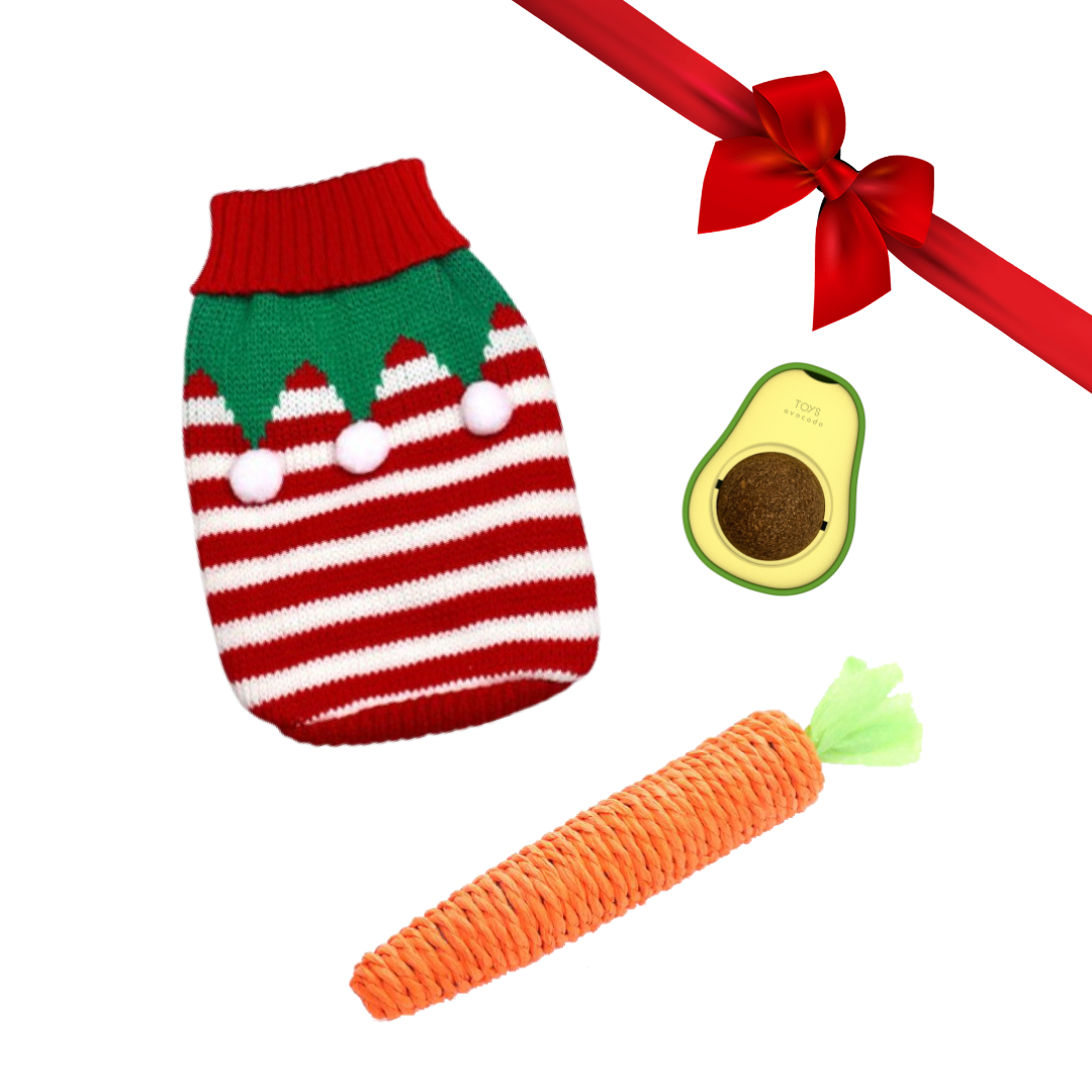 У цьому святковому наборі все, що зробить свята теплішими, цікавішими й веселішими для вашого улюбленця: святковий светрик, дряпка у формі морквинки, ролик-лизун з котячою м’ятою та маленький секретний сюрприз. Ідеальний подарунок для вашого котика або для друзів-котолюбчиків!